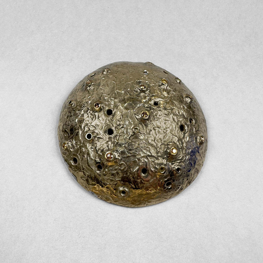 Collier girocollo in bronzo con maxi pendente testurizzato e traforato. Il pendente è ornato da 11 diamanti taglio brillante color cognac