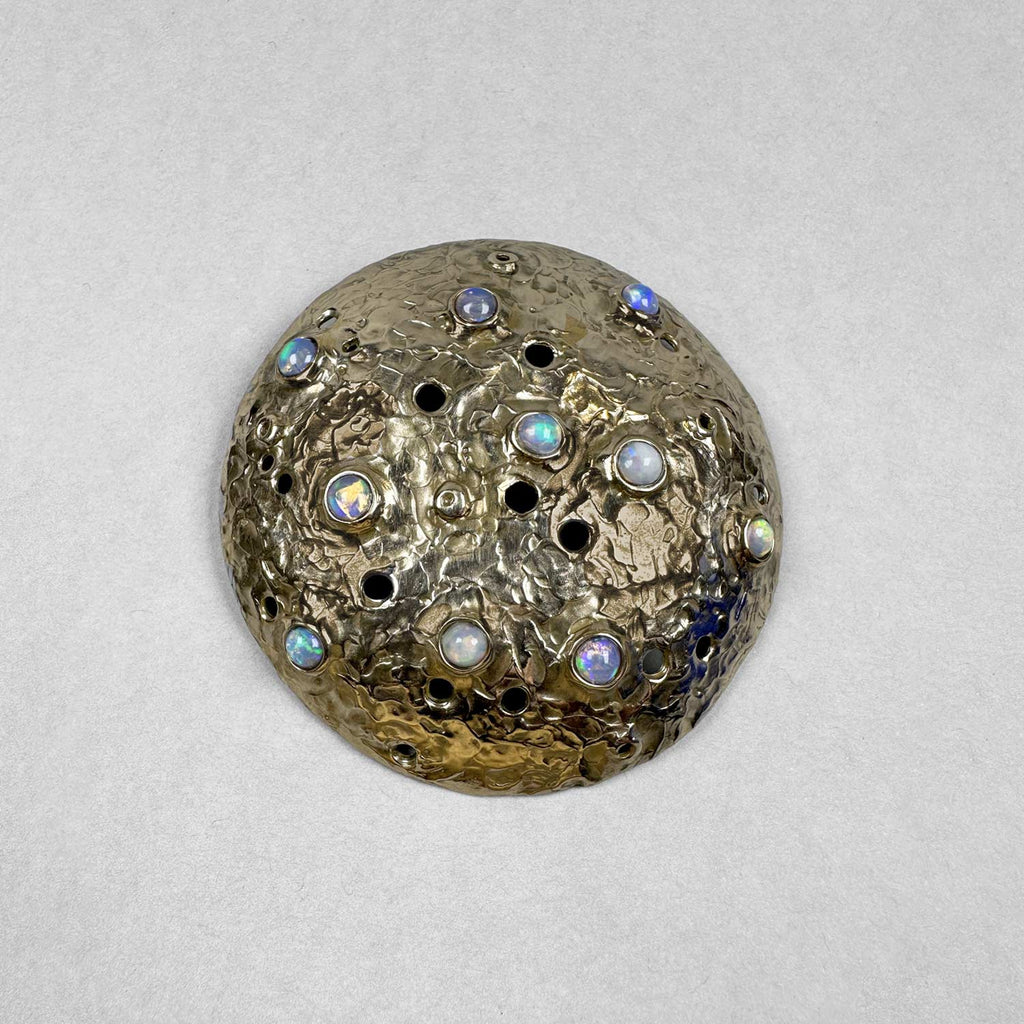 Collier girocollo in bronzo con maxi pendente testurizzato e traforato. Il pendente è impreziosito da 10 cabochon di opale bianco etiope