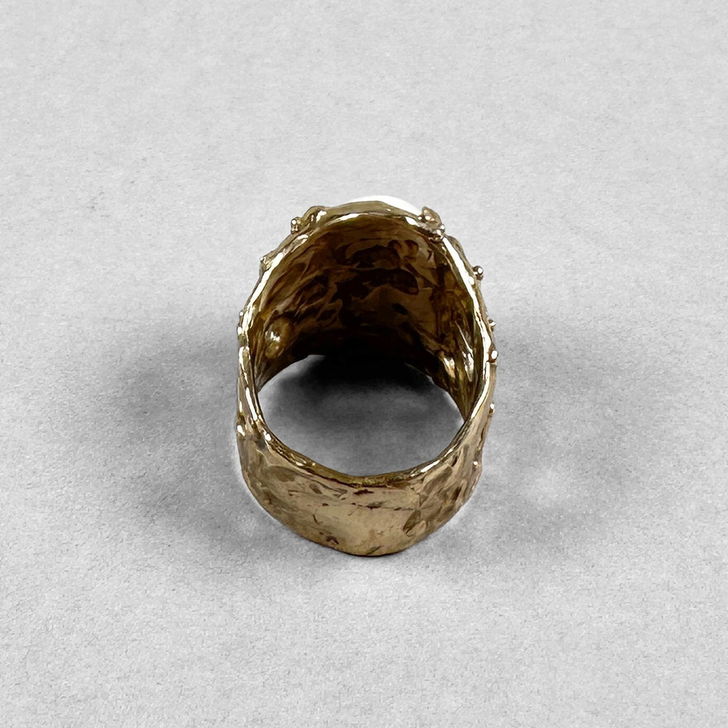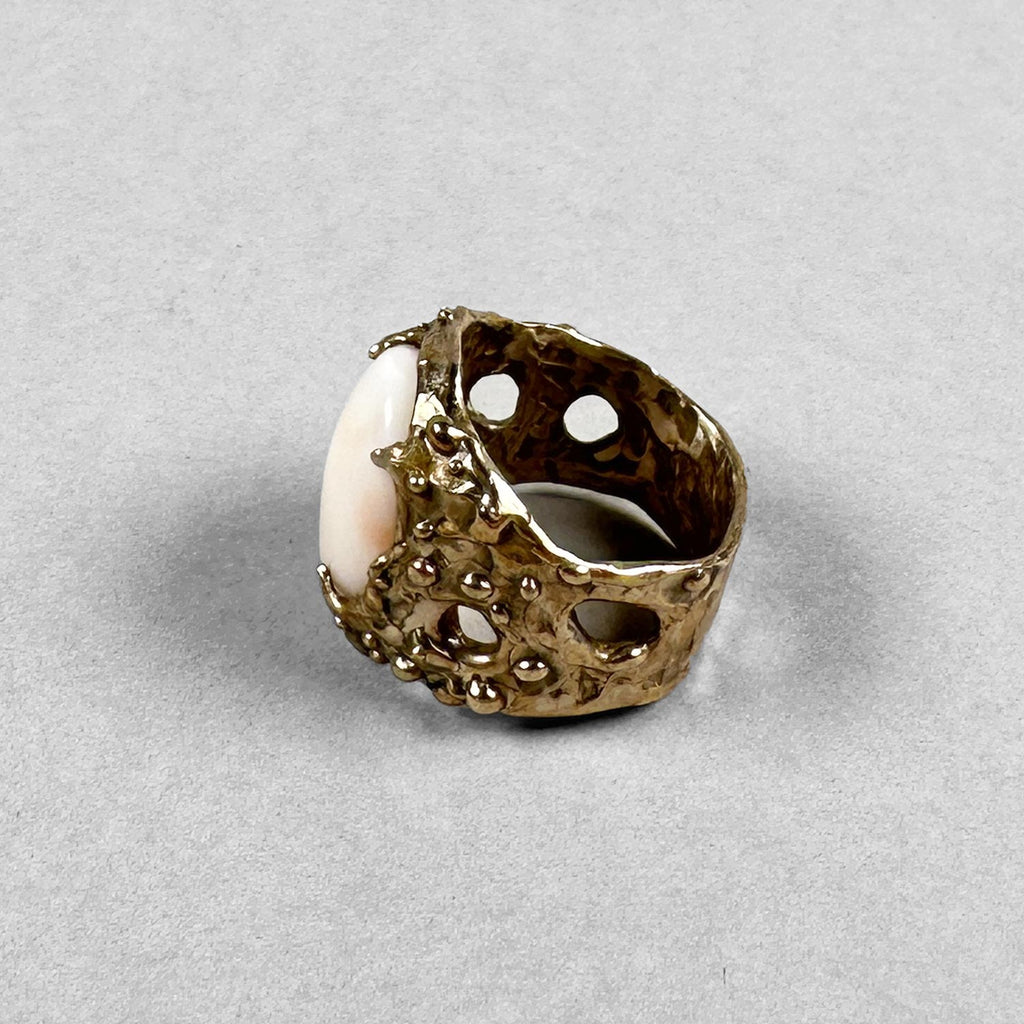 Anello testurizzato e traforato in bronzo con cabochon di corallo rosa