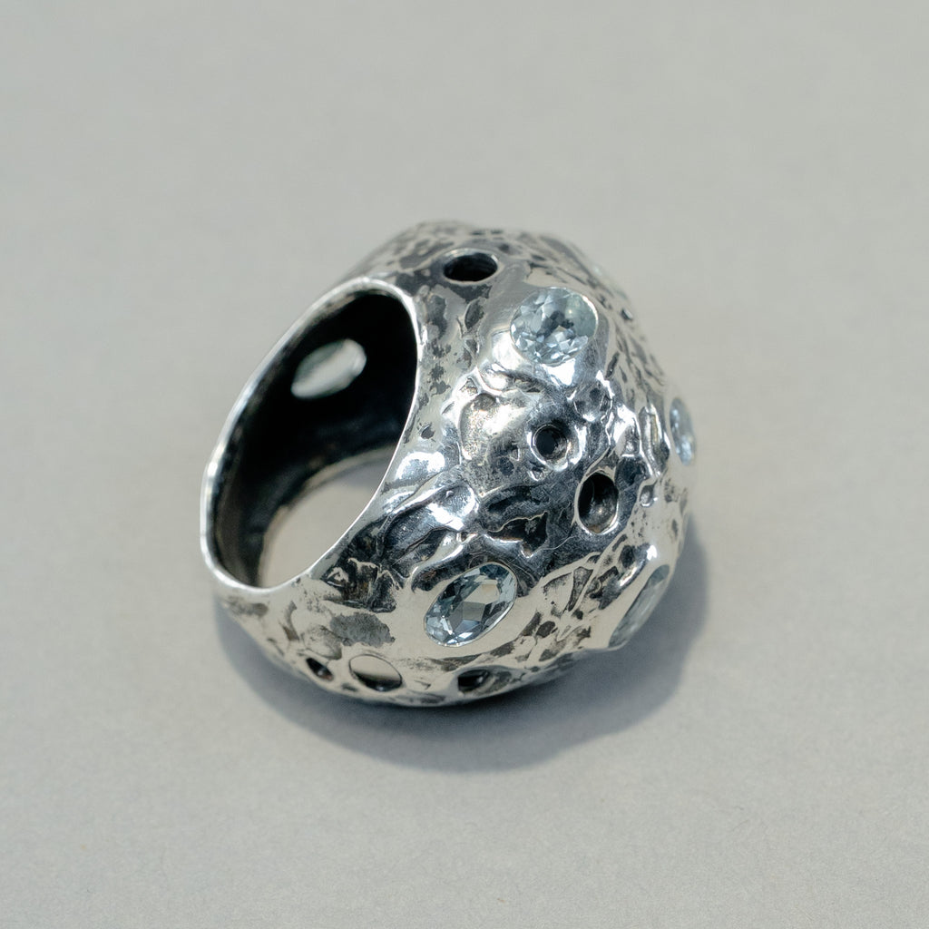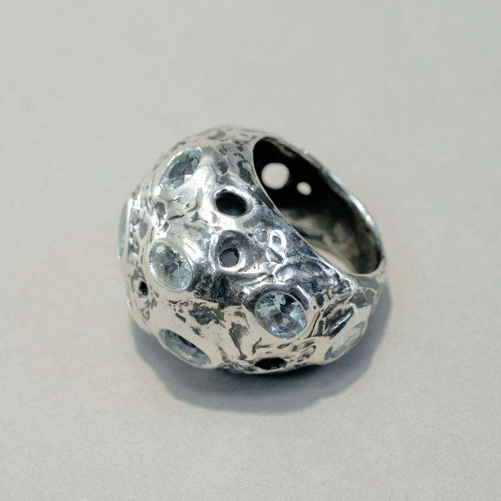 Anello in argento brunito, ornato da 9 acquamarine ovali sfaccettate per un peso totale di 4 carati.