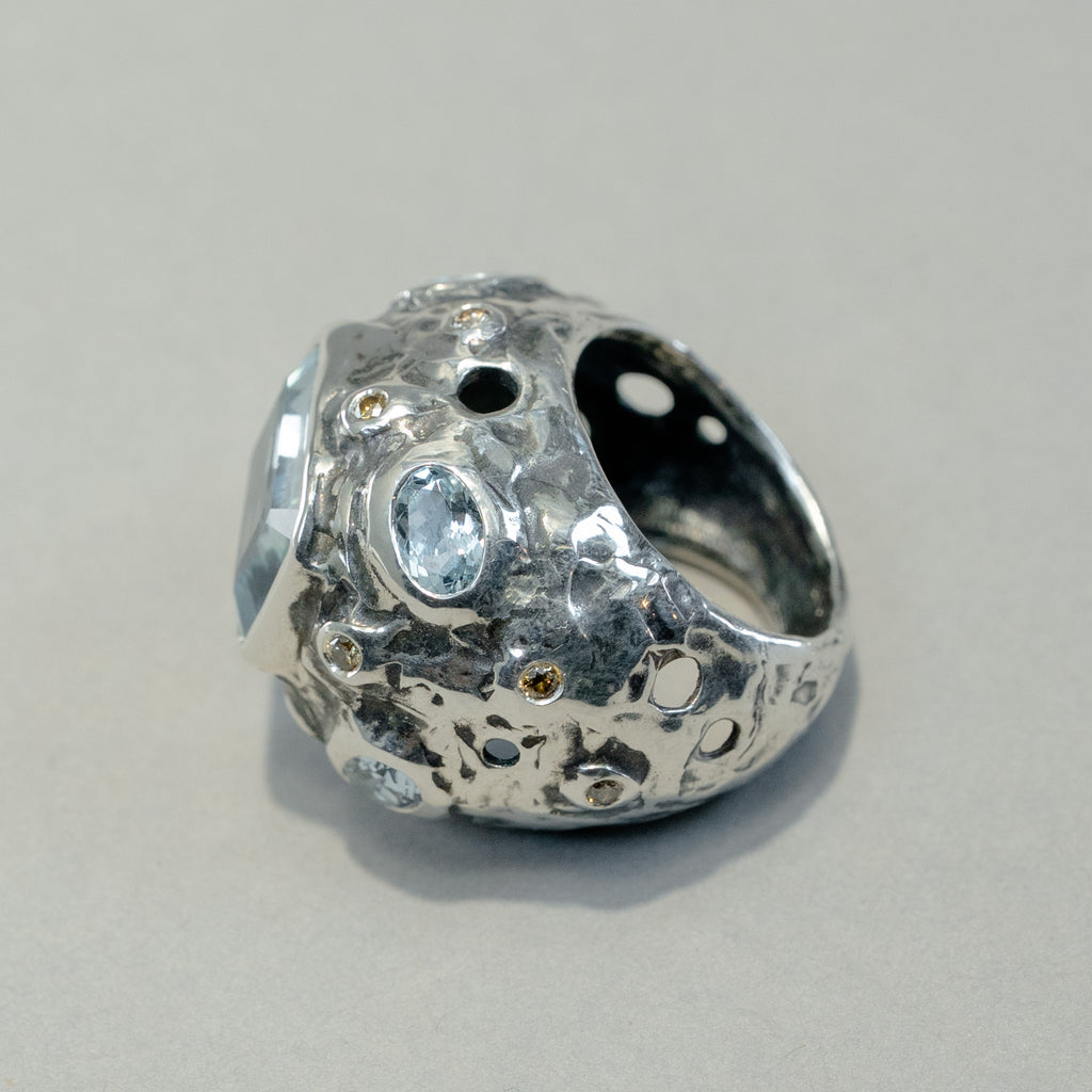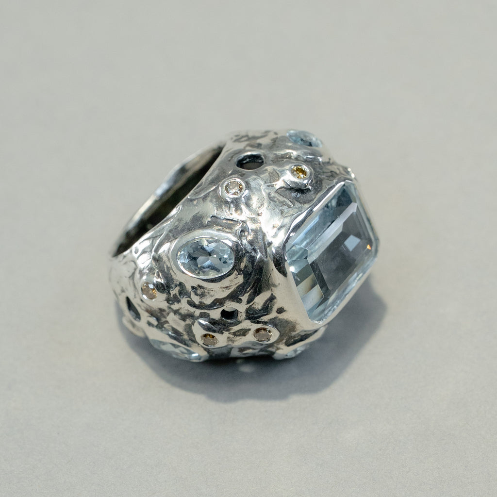 Anello in argento brunito, impreziosito da un’acquamarina centrale taglio smeraldo da 6 carati, affiancata da cinque acquamarine taglio ovale sfaccettato per un totale di 2 carati e da dieci diamanti brown taglio brillante per un peso complessivo di 0,30 carati.
