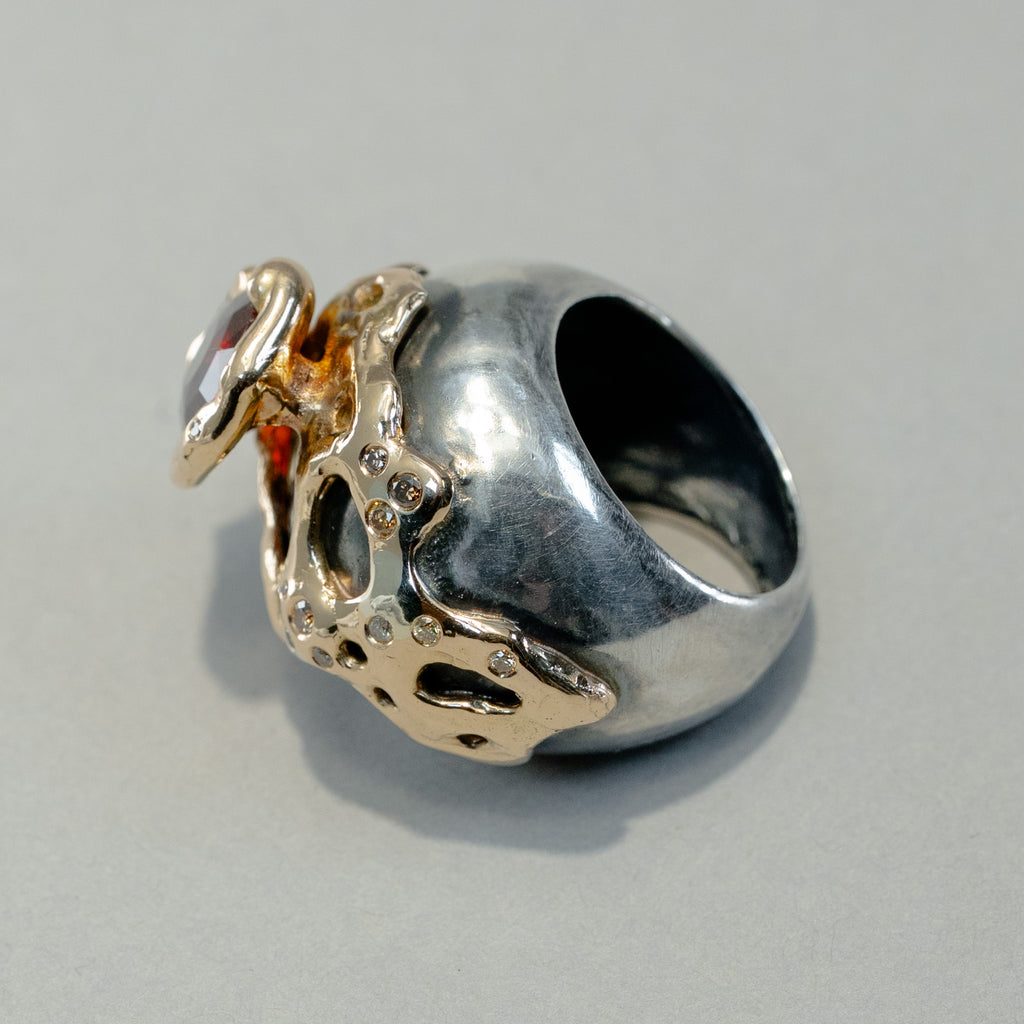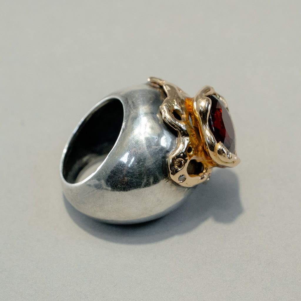 Anello in argento brunito e oro rosa, impreziosito da un granato ovale sfaccettato di 5 carati e da 17 diamanti brown taglio brillante, per un peso totale di 0,50 carati.