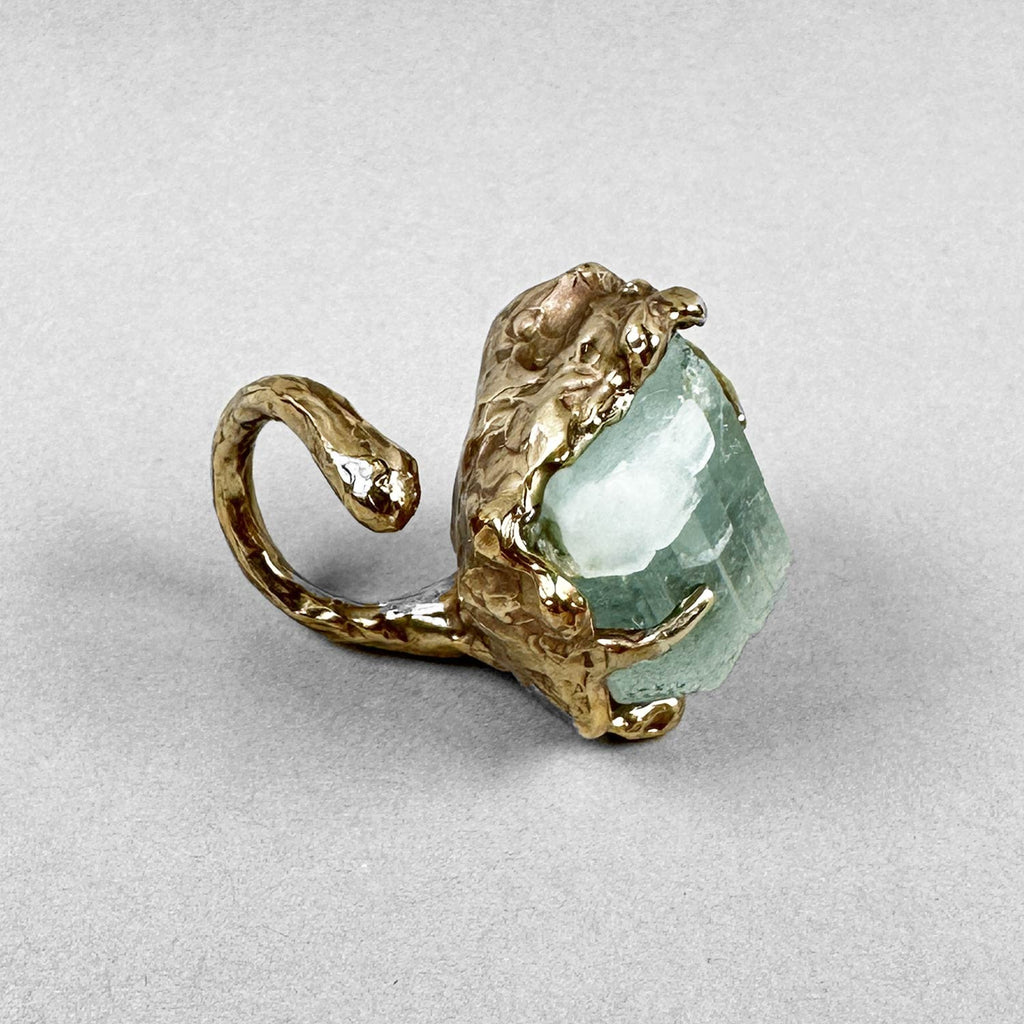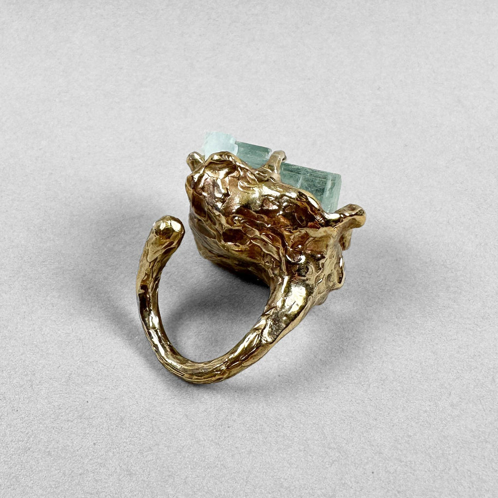 Anello scultura in bronzo testurizzato e cristallo grezzo di acquamarina