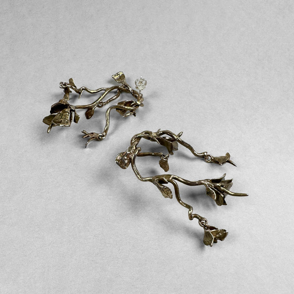 Coppia di orecchini pendenti in bronzo. Chiusura con perno e farfalla