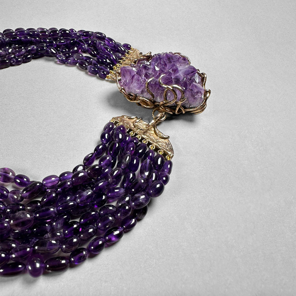 Grande collier girocollo costituito da nove fili di perline ovali di ametista, chiusura scultura in bronzo e drusa di ametista