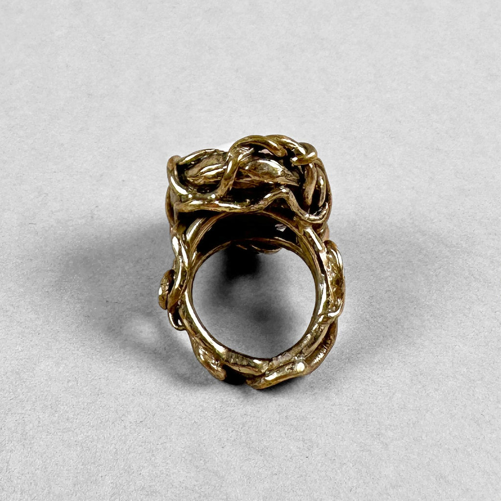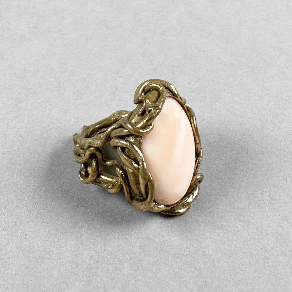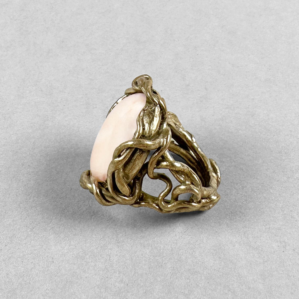 Anello scultura in bronzo testurizzato e cabochon di corallo rosa