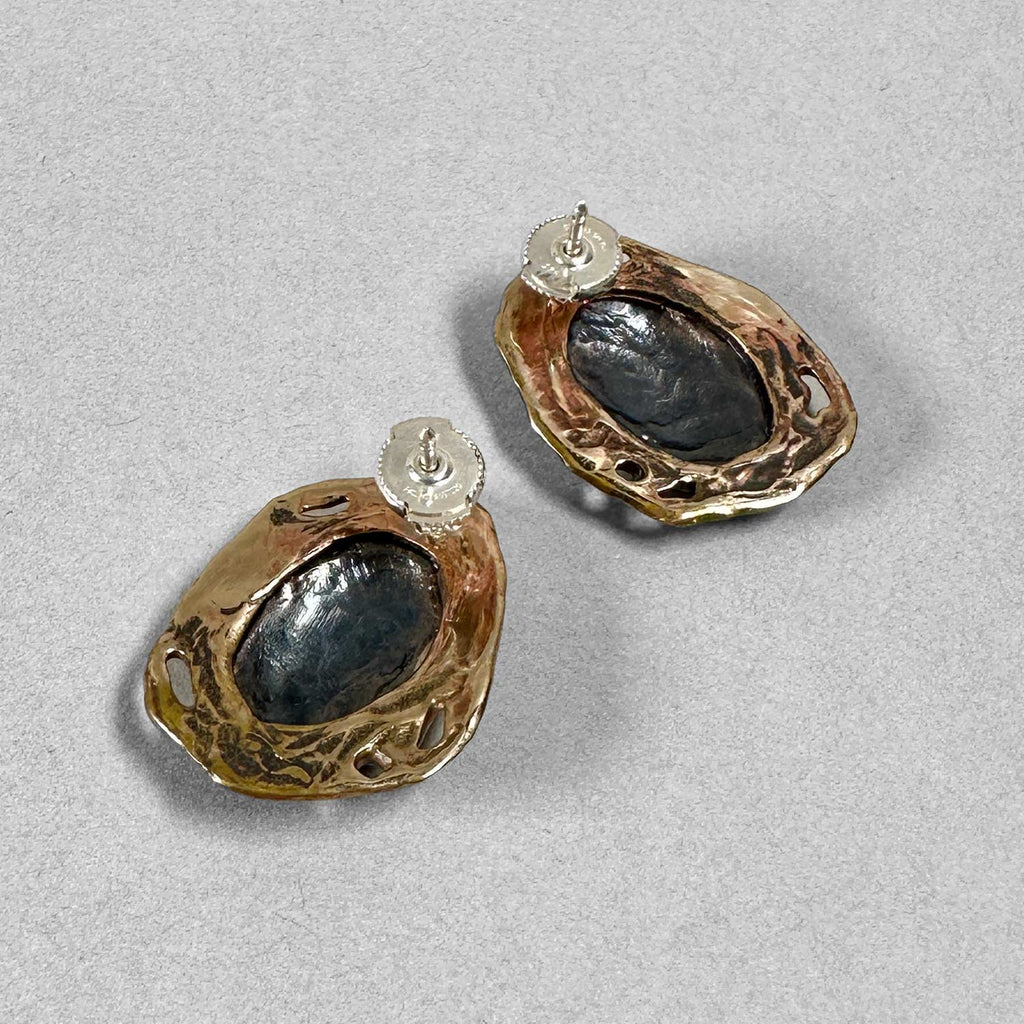 Coppia di orecchini in bronzo testurizzato e traforato con due cammei raffiguranti imperatori romani in argento patinato