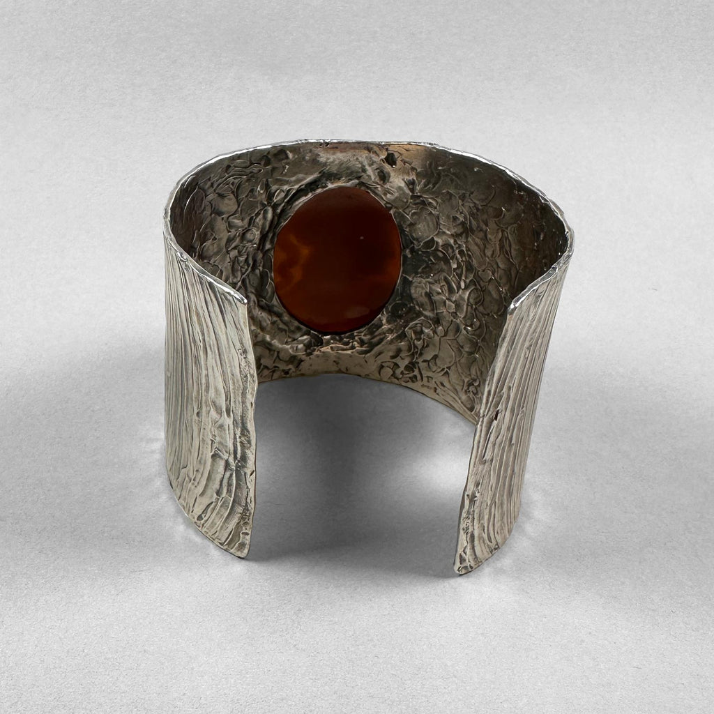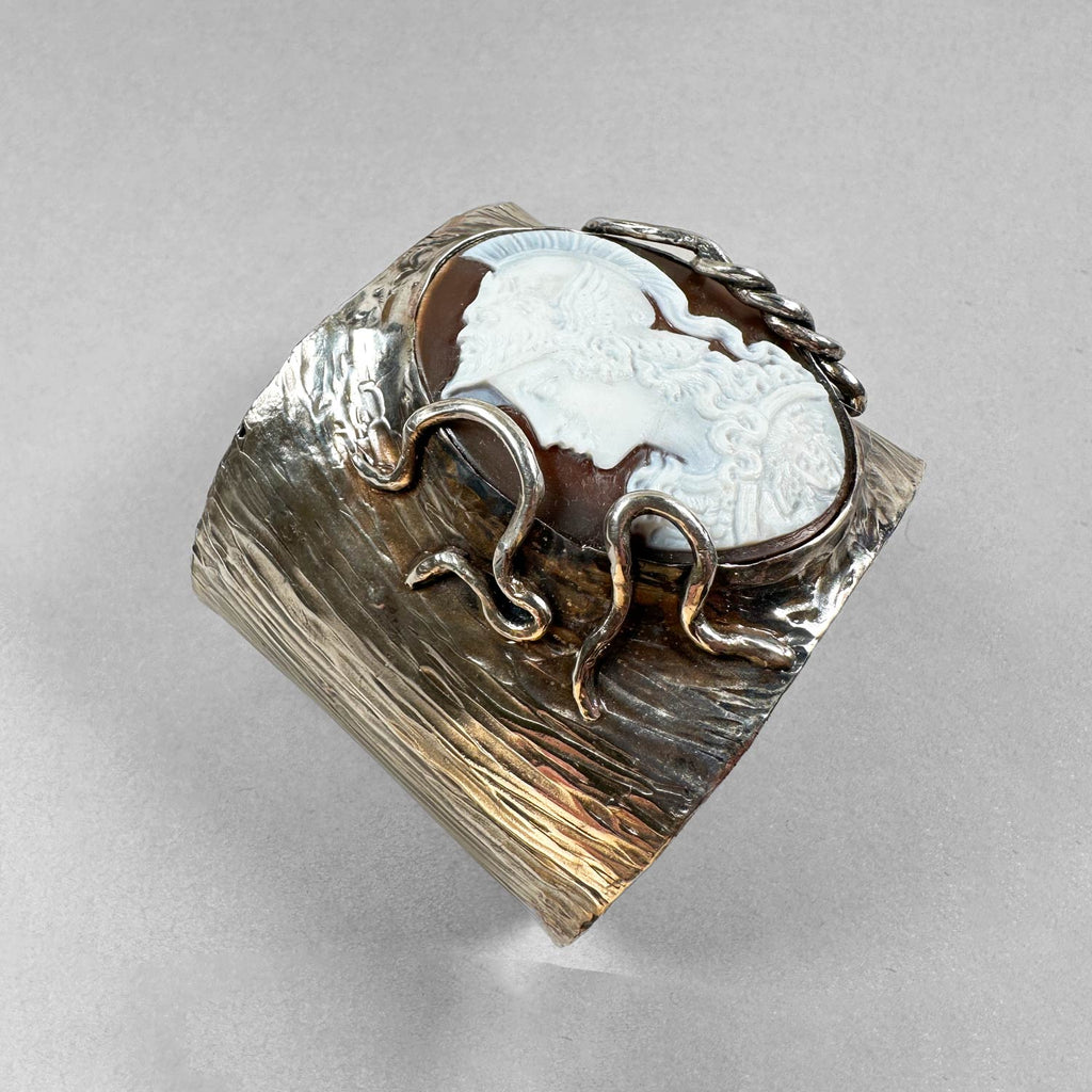 Bracciale testurizzato in argento patinato con cammeo inciso a mano su conchiglia sardonica raffigurante Minerva