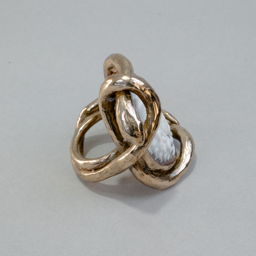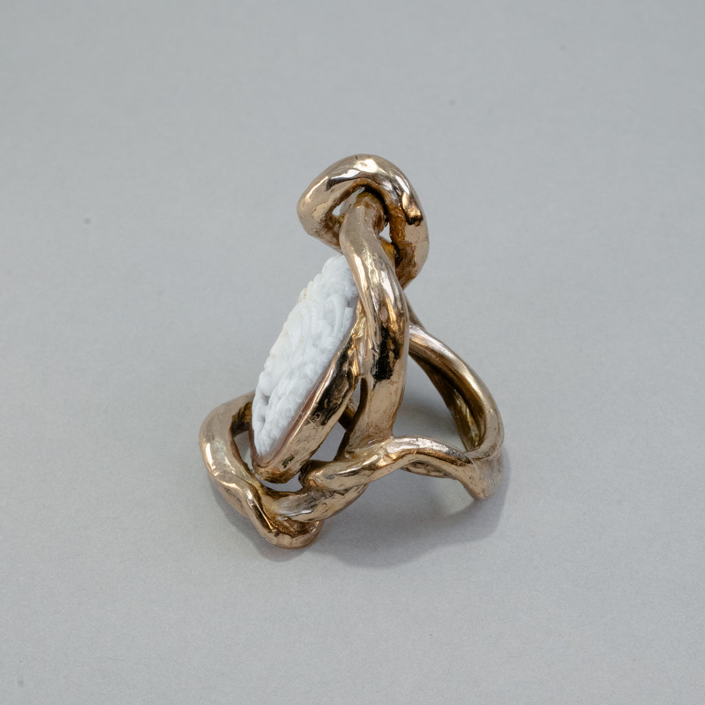 Anello scultura in bronzo con cammeo inciso a mano su conchiglia sardonica raffigurante la testa di medusa
