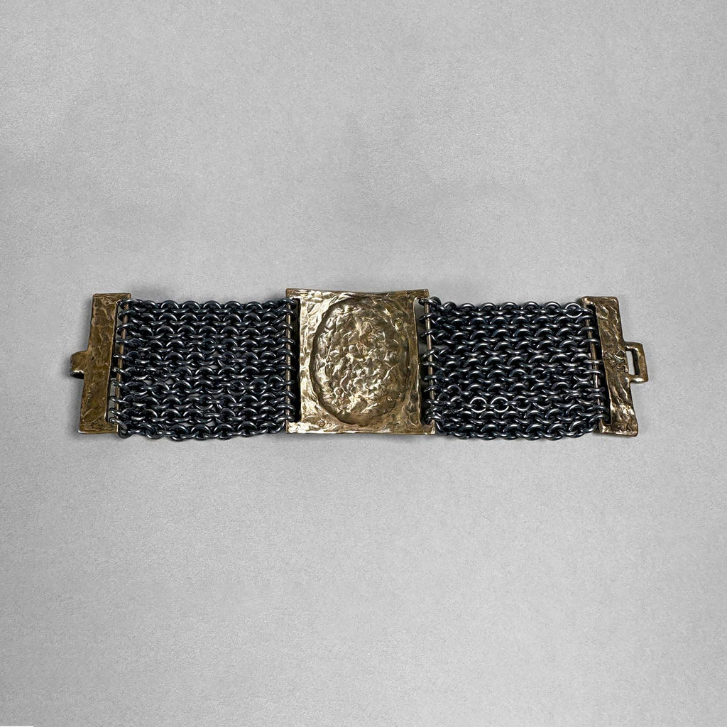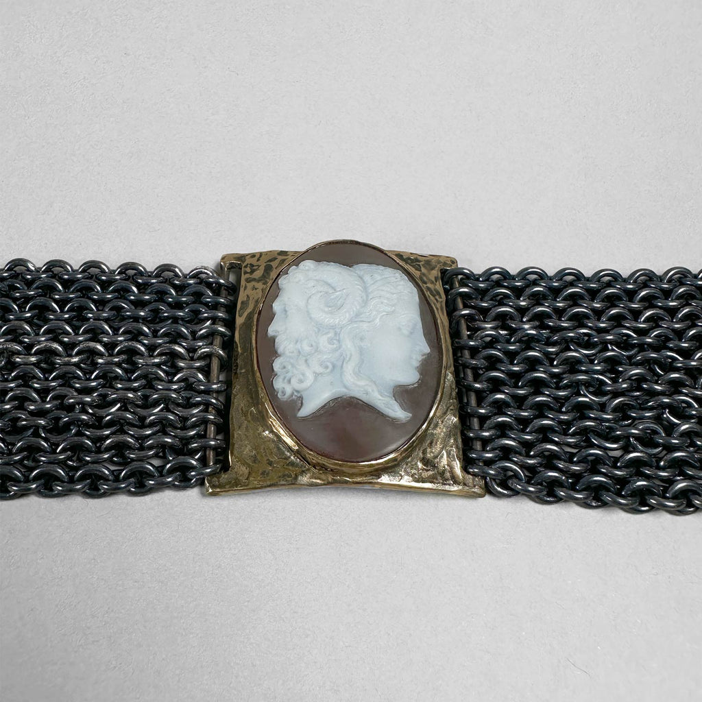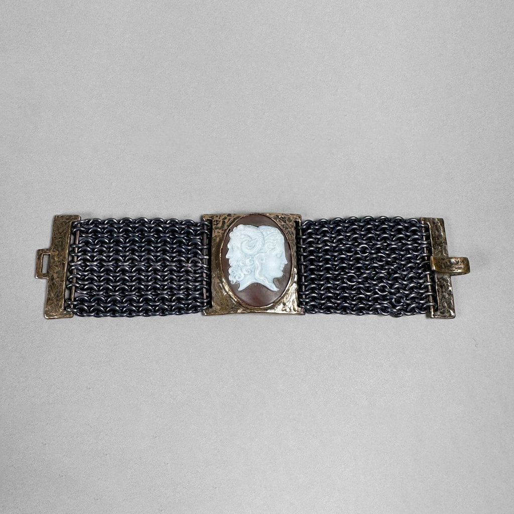 Bracciale costituito da catene di argento patinato, chiusura e centrale in bronzo. La parte centrale ospita un cammeo inciso a mano su conchiglia sardonica raffigurante Giano bifronte
