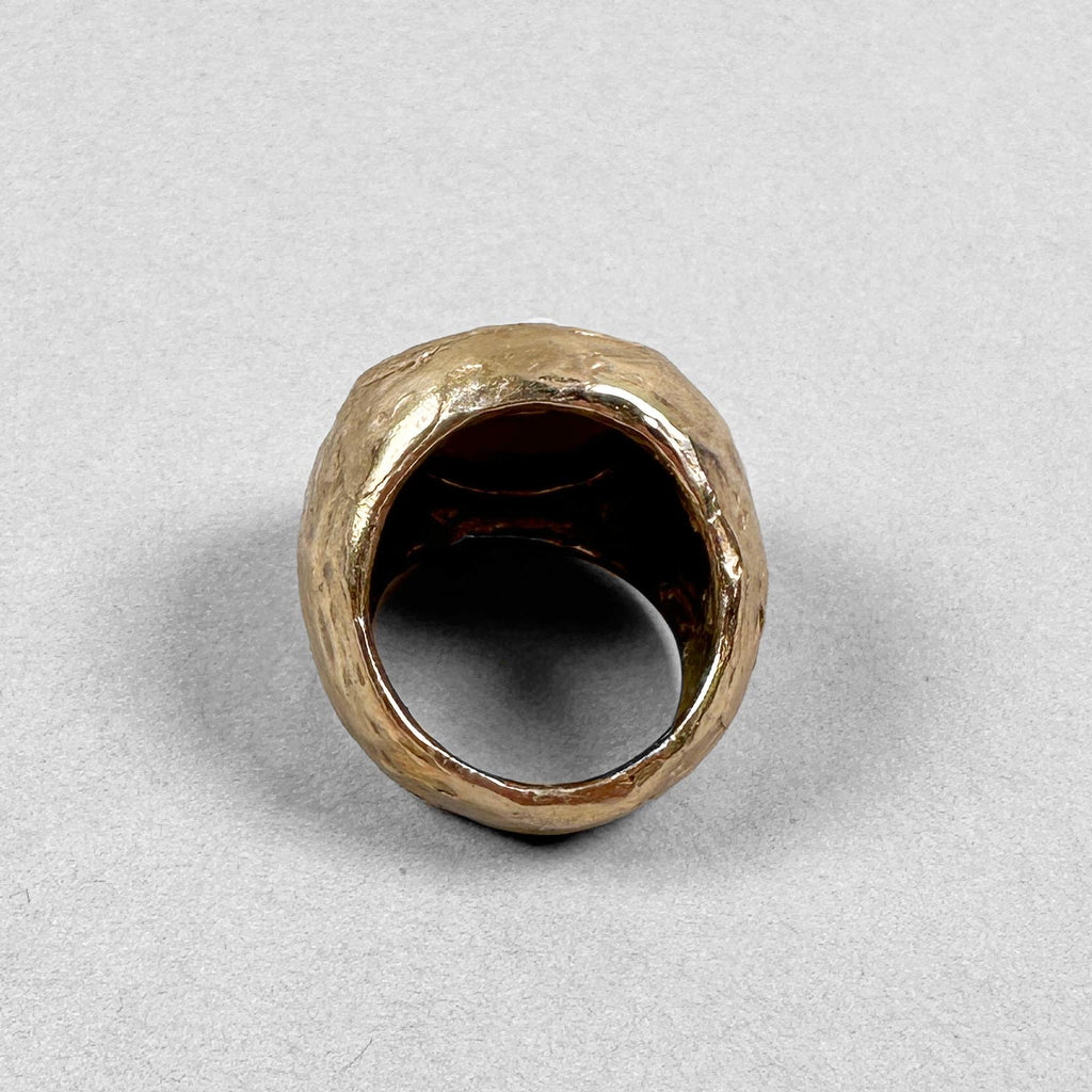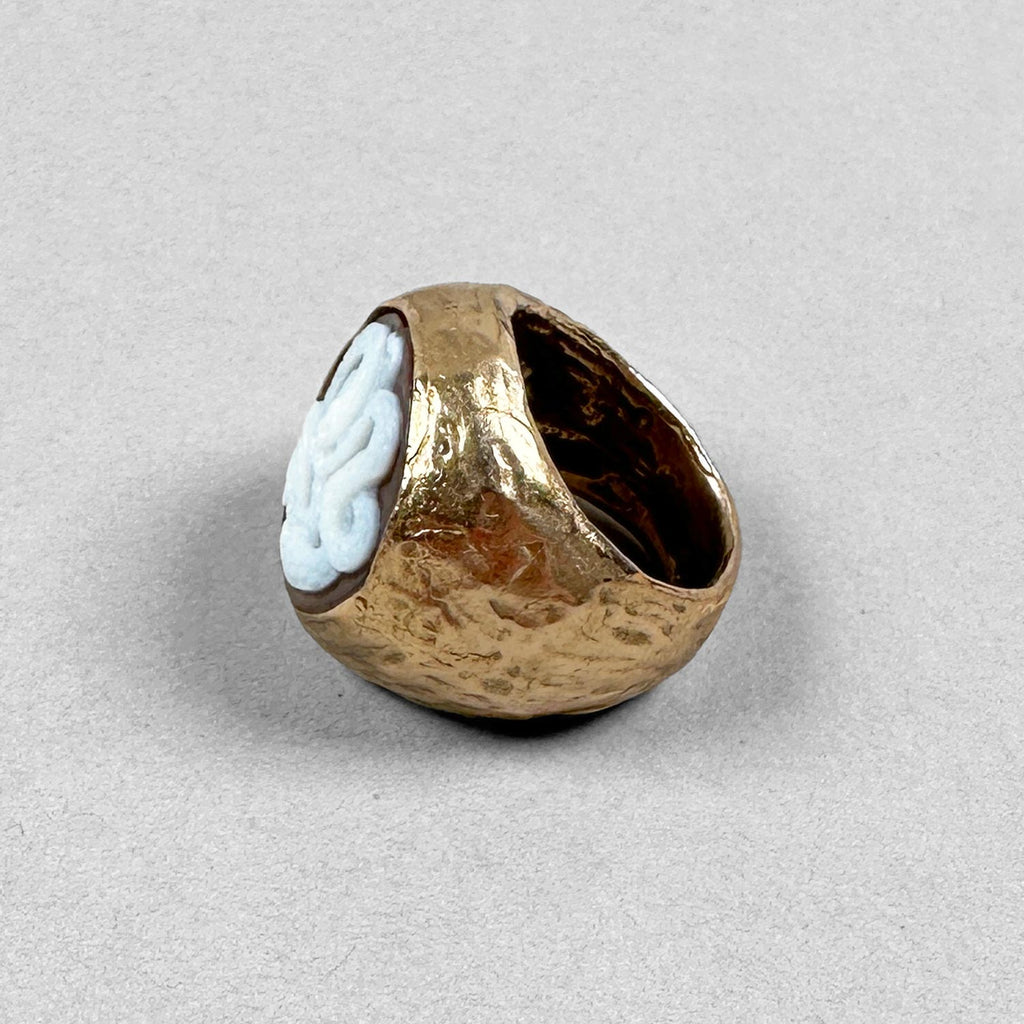 Anello chevaliere in bronzo con cammeo inciso a mano su conchiglia sardonica raffigurante due serpenti