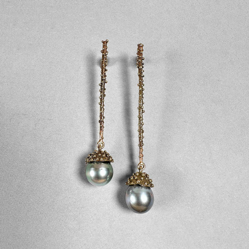 Orecchini asimmetrici in bronzo con texture granulata e perle di tahiti. Chiusura con perno e farfalla.