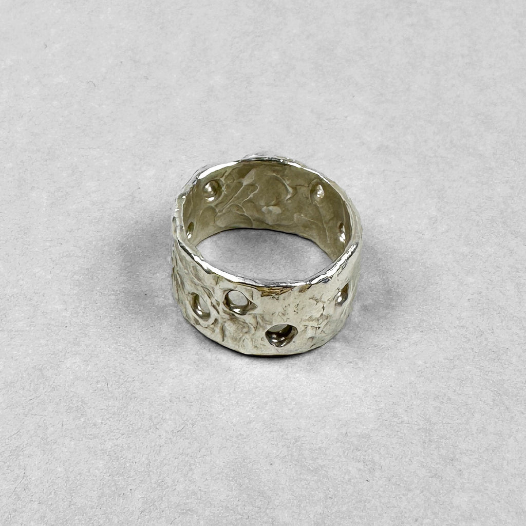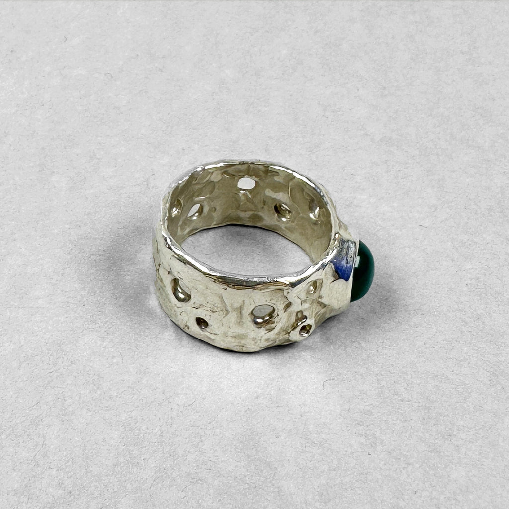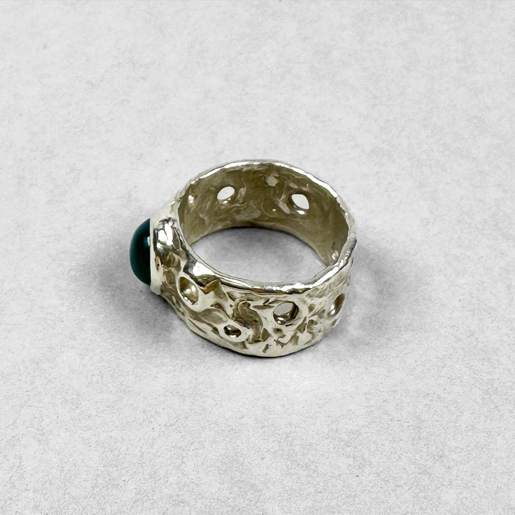 Anello testurizzato e traforato in argento con cabochon di onice verde