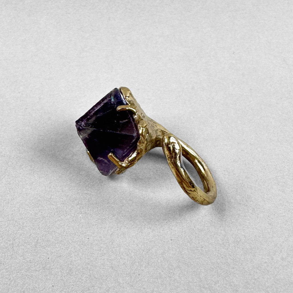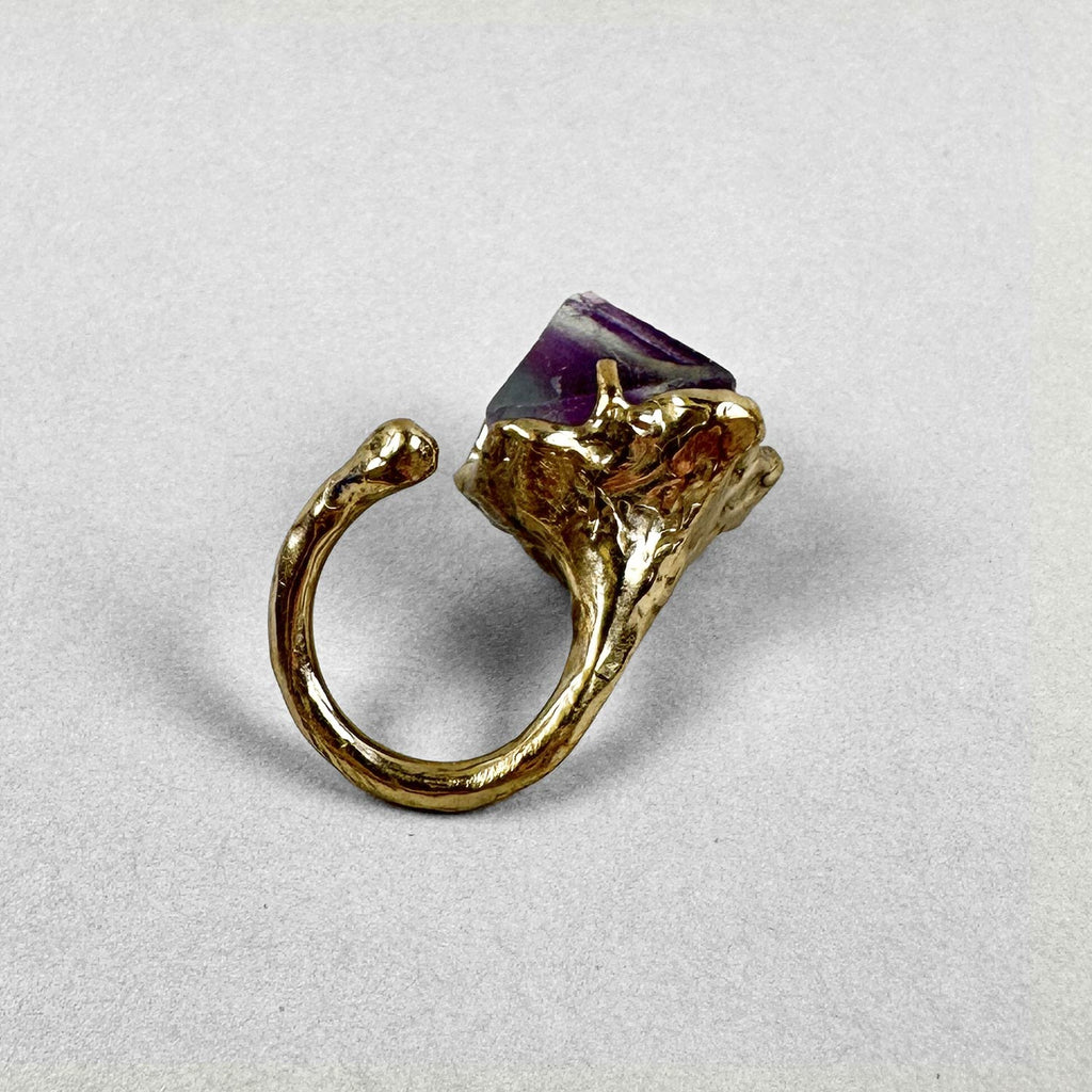 Anello scultura in bronzo testurizzato e cristallo grezzo di fluorite