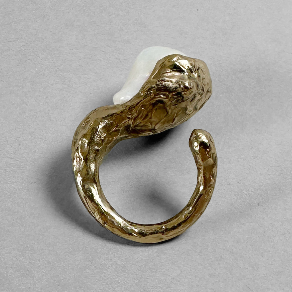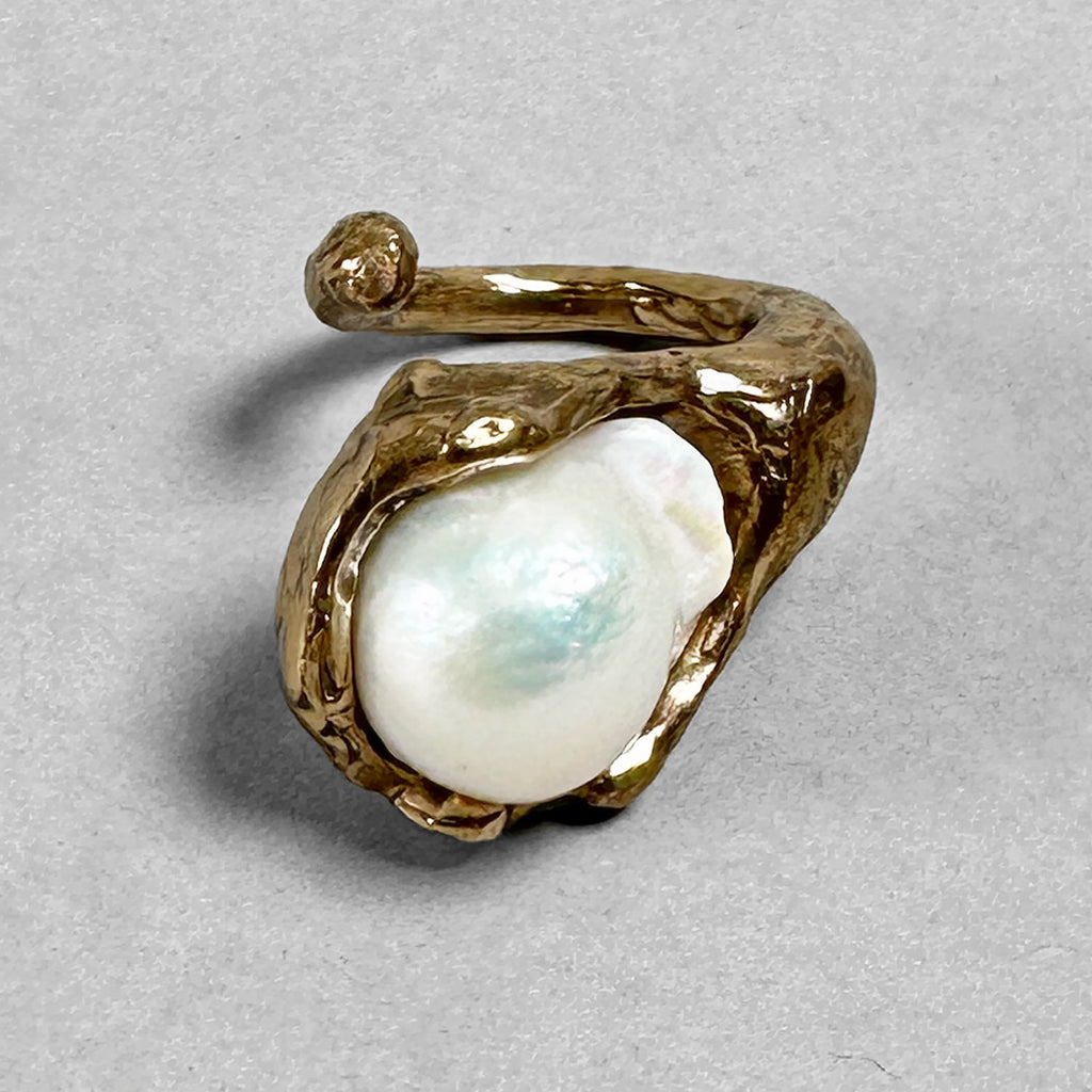 Anello aperto in bronzo e perla barocca di acqua dolce
