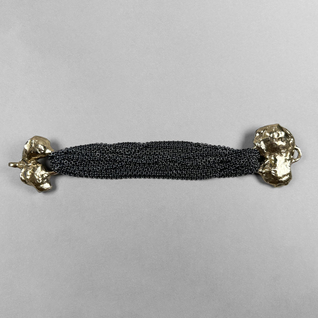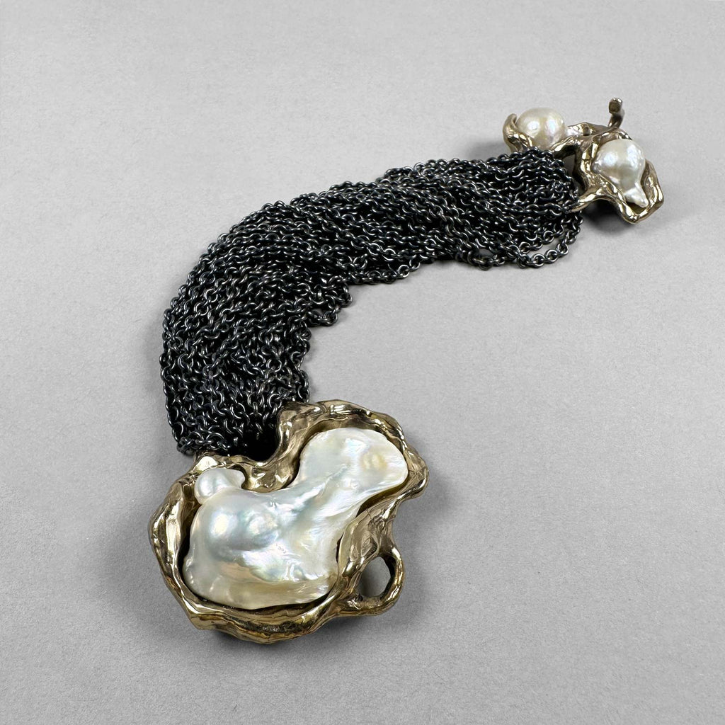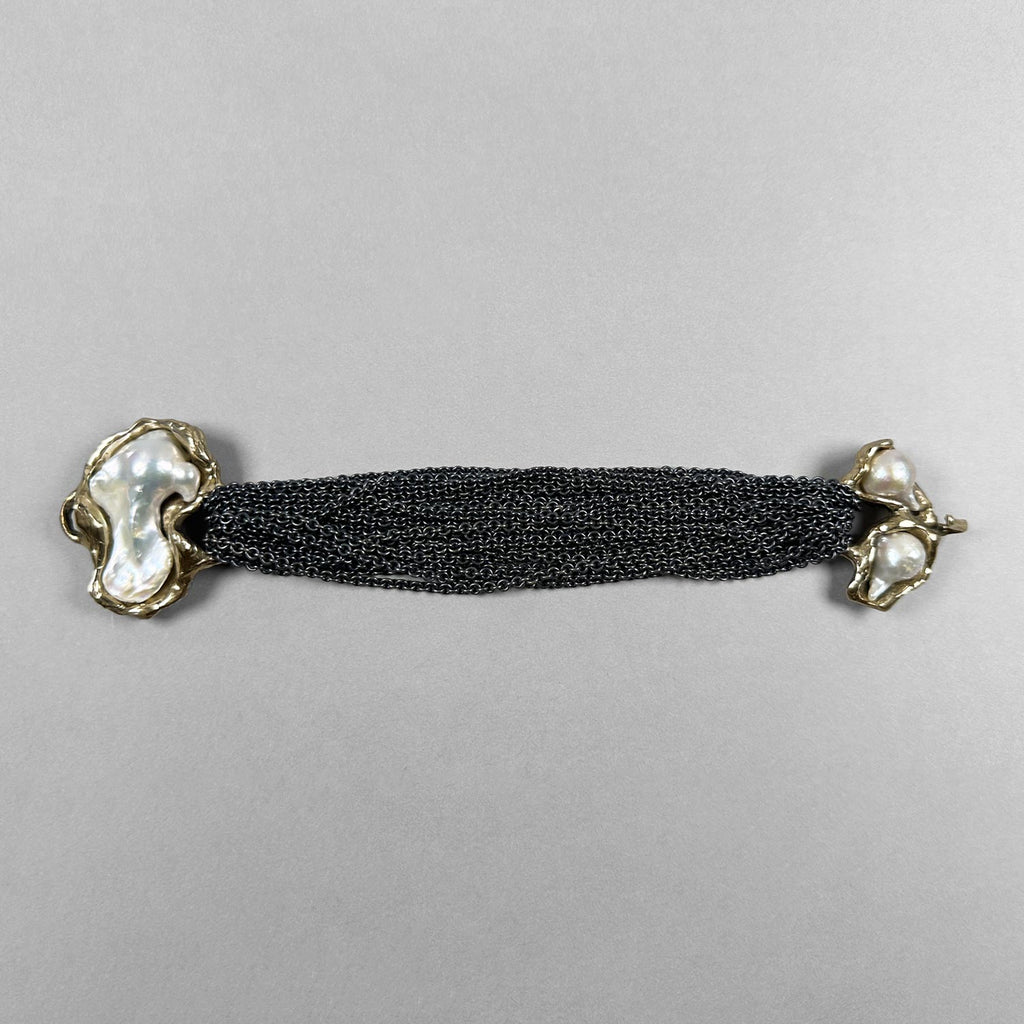 Bracciale composto da una moltitudine di catene in argento annerito con maxi chiusura in bronzo e perle barocche di acqua dolce